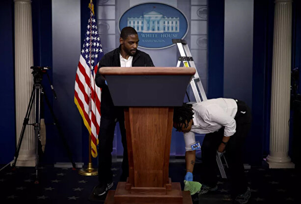 Beyaz Saray'da görevli işçilerinin, Başkan Trump'ın günlük koronavirüs basın toplantılarının çoğunun yapıldığı açıklama yapılan odayı temizlediği görülüyor. Tüm fotoğraflarda, çoğu siyahi işçilerin eldivenli, ancak önlük veya maske olmadan çalıştığı görülüyor.
