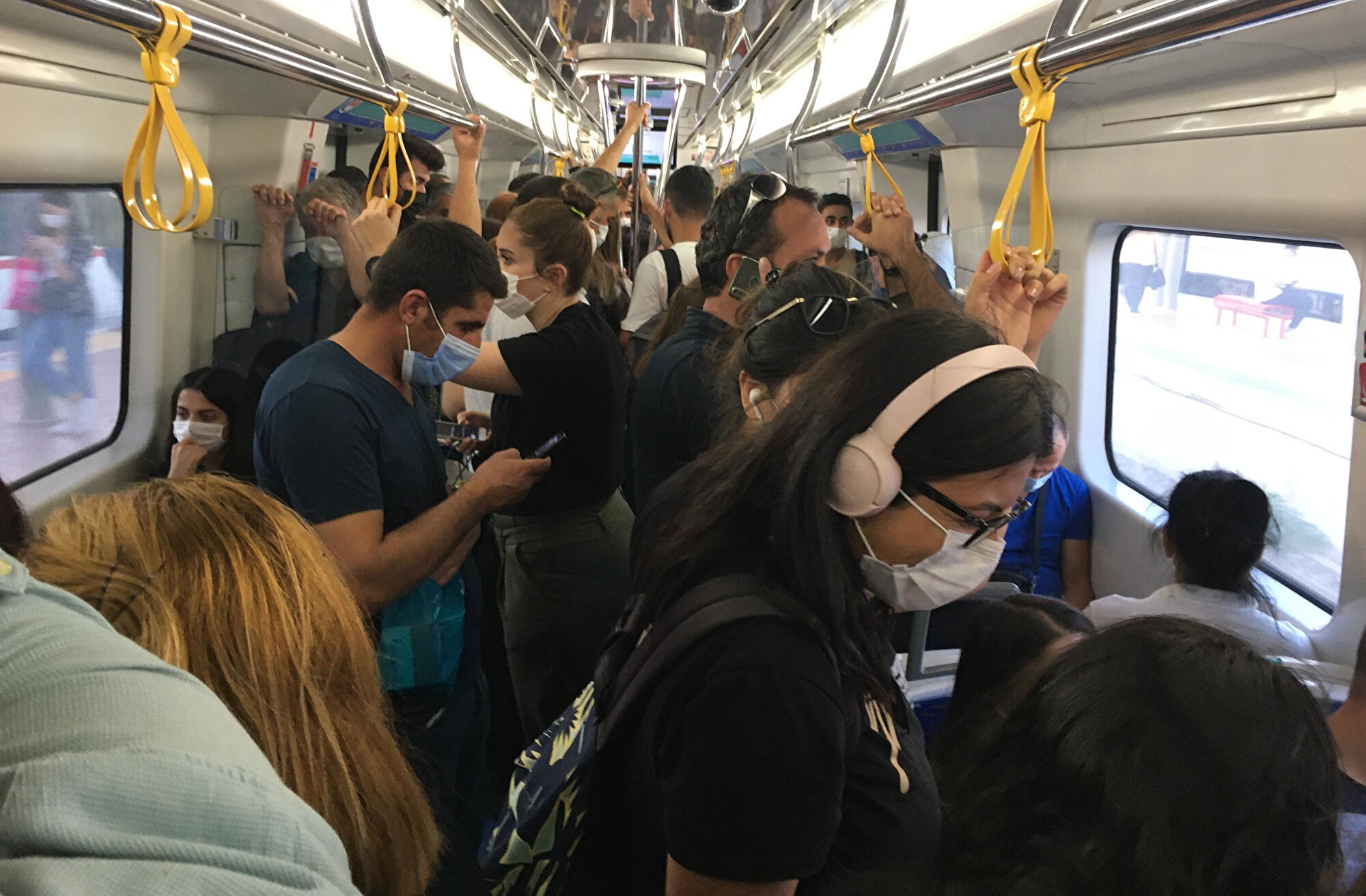 İzmir'de, kentin en büyük toplu taşıma ağlarından olan İZBAN'da, sabah ve akşam işe gidiş ve çıkış saatlerinde yoğunluk yaşanıyor. Kalabalıklar nedeniyle koronavirüsle mücadelede temel önlemlerden olan 'sosyal mesafe' kuralına uyulamıyor. Trenlerde yaşanan yoğunluk, vatandaşların cep telefonlarına yansıdı. Akşam saatinde çekilen görüntülerde, vatandaşların hemen hepsinin maske kuralına uyduğu, ancak sosyal mesafe kuralına uyulmadığı görüldü. İzmirliler, yoğunluğu azaltmak için yetkililerden ek sefer koyulması talebinde bulundu.