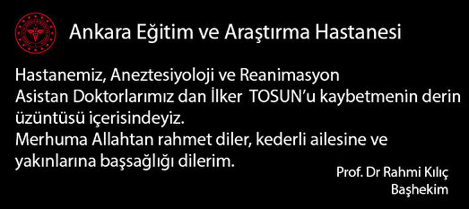 Öte yandan Ankara Eğitim ve Araştırma Hastanesi'nden yapılan açıklamada, "Ankara Eğitim ve Araştırma Hastanesi Anesteziyoloji ve Reanimasyon Kliniği asistan hekimi doktor İlker Tosun'un vefat haberini vermekten derin üzüntü duymaktayız. Genç meslektaşımıza Allah'tan rahmet, kederli ailesi ve yakınlarına sabırlar dileriz" denildi.