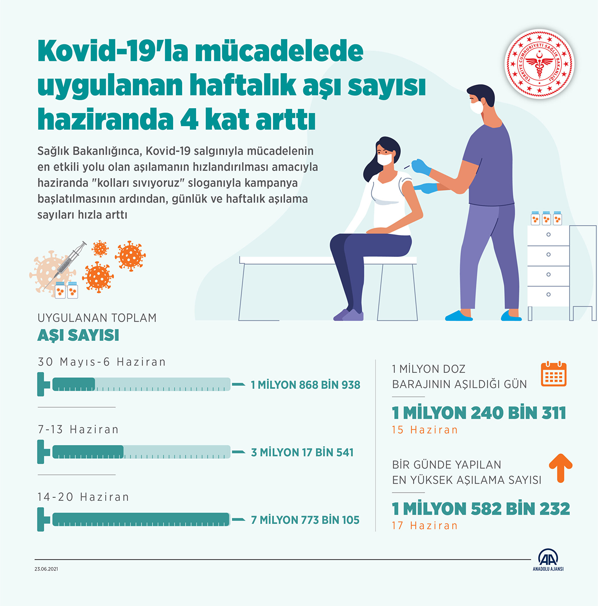 Kovid-19'la mücadele kapsamında, Türkiye'de haftalık aşılama sayısı, haziranda 4 kat artarak 14-20 Haziran'da 7 milyon 773 bin 105'e yükseldi. Ülke genelinde, 30 Mayıs-6 Haziran'da toplam 1 milyon 868 bin 938 Kovid-19 aşısı uygulanırken, bu sayı 14-20 Haziran'da 7 milyon 773 bin 105'e ulaştı. Bir günde yapılan en yüksek aşılama sayısı ise 17 Haziran'da 1 milyon 582 bin 232 olarak kayıtlara geçti.
