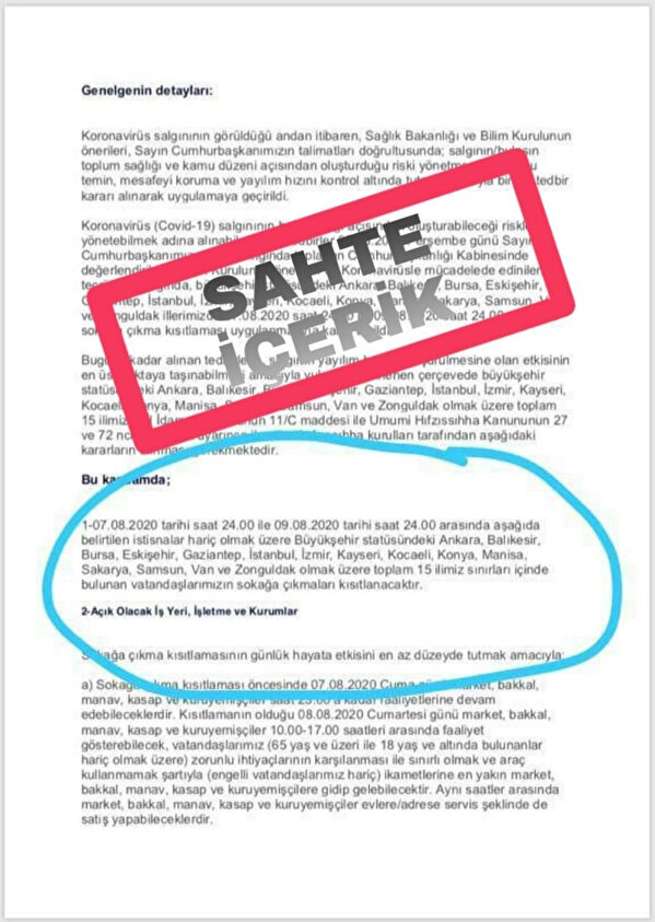 Koronavirüs vakalarında son günlerde yaşanan artış sonrası sosyal medyada ortaya atılan yer alan 15 ilde 7-9 Ağustos 2020 tarihlerine denk gelen hafta sonu için sokağa çıkma kısıtlaması olacağı yönündeki iddiaya İçişleri Bakan Yardımcısı İsmail Çataklı'dan yalanlama geldi. Çataklı, "Bu tür kaynağı belli olmayan sahte belgelere itibar edilmemesi rica olunur" dedi.