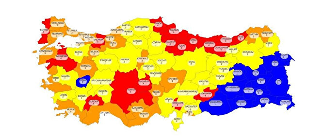 Sağlık Bakanlığı tarafından açıklanan haritaya göre mavi, sarı ve turuncu renkteki illerde restoran ve kafeler hizmet vermeye başlayacak.