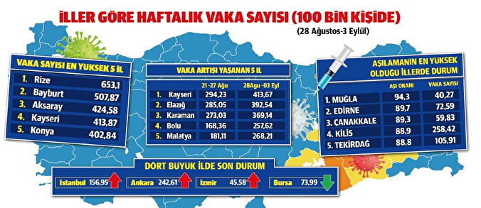 Sağlık Bakanı Fahrettin Koca, 28 Ağustos-3 Eylül’de illere göre her 100 bin kişide görülen Kovid-19 vaka sayılarını açıkladı. Koca, vaka yoğunluğu bir önceki haftaya göre en çok artan 10 ilin Kayseri, Elazığ, Karaman, Bolu, Malatya, Kırşehir, Yozgat, Kırıkkale, Tunceli ve Bartın olduğunu belirtti. “Bu illerden birindeyseniz, şu günlerde daha da dikkatli olmalısınız.” ifadelerini kullanan Koca, nihai çözümün aşı ve kurallara uymak olduğunu vurguladı. 28 Ağustos-3 Eylül’de Kovid-19 vaka sayısı İstanbul’da 156,95, Ankara’da 242,61, İzmir’de 45,58 oldu. Önceki hafta, (21-27 Ağustos) her 100 bin kişide Kovid-19 vaka sayısı İstanbul’da 148,33, Ankara’da 194,96, İzmir’de 43,30 olmuştu. Her 100 bin kişide en az Kovid-19 vakası görülen iller Aydın, Muğla, Antalya, İzmir ve Kırklareli olarak gerçekleşti.