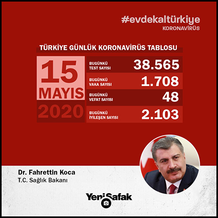 Koronavirüs (Kovid-19) pandemisi dünyada hızla yayılmaya devam ediyor. Türkiye'de ilk vakanın görüldüğü 11 Mart'tan bu yana titizlikle verilen mücadele sonuçlarını vermeye başladı. Sağlık Bakanı Fahrettin Koca'nın açıkladığı 15 Mayıs koronavirüs verileri bu olumlu gidişi ortaya koydu.