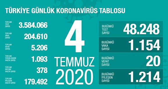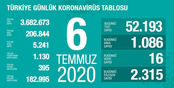 Sağlık Bakanı Fahrettin Koca, 8 Temmuz günü itibari ile son 24 saatte gerçekleşen koronavirüsle ilgili ölüm ve toplam vaka sayısını açıkladı. Bakan Koca, verileri Sağlık Bakanlığı Korona Tablosunun görseliyle duyurdu.