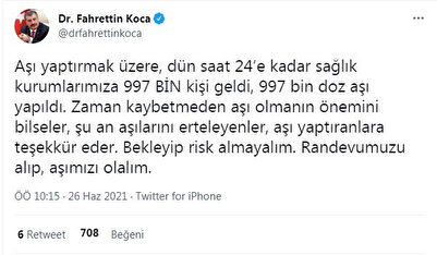 Aşı yaptırmak üzere, dün saat 24.00'e kadar sağlık kurumlarımıza 997 bin kişi geldi, 997 bin doz aşı yapıldı.
