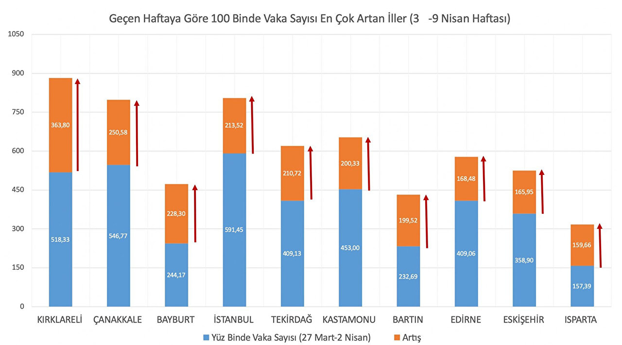 Sağlık Bakanı Fahrettin Koca, haftalık vaka sayısında en çok artış yaşanan illeri açıkladı. Sosyal medyadan yaptığı paylaşımda bulunan bakan Koca, "100 bin nüfusa karşılık gelen haftalık vaka sayısında en çok artış Kırklareli, Çanakkale, Bayburt, İstanbul ve Tekirdağ'da oldu. Samsun ve Ardahan'da ise azalış gerçekleşti" ifadelerini kullandı.