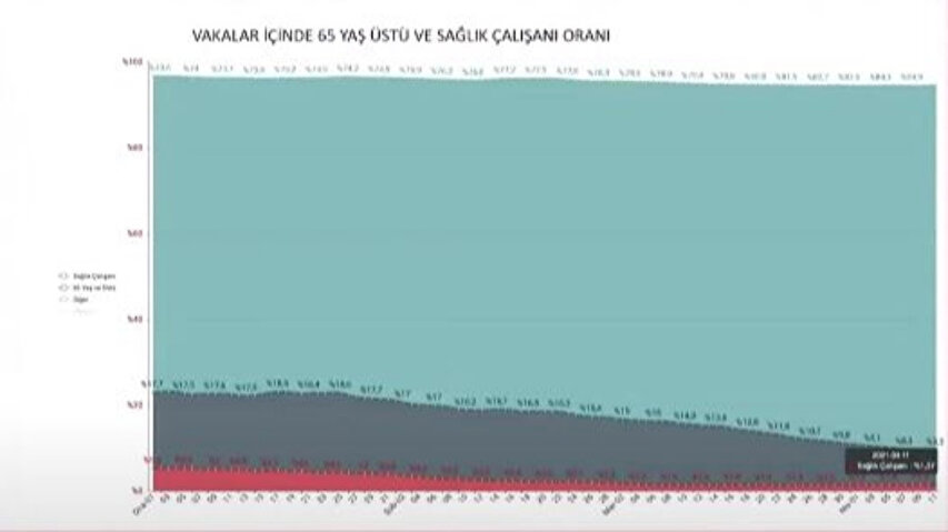 Aşılama sonrası toplam vaka sayısı içinde sağlık çalışanları ve 65 üstü vatandaşlar yarı yarıya düşmüş vaziyette.