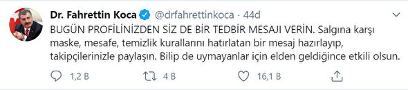 Sağlık Bakanı Fahrettin Koca, sosyal medya hesabından açıklamalarda bulundu. Bakan Koca, "Salgına karşı maske, mesafe, temizlik kurallarını hatırlatan bir mesaj hazırlayıp, takipçilerinizle paylaşın." ifadelerini kullandı.