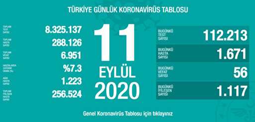 Sağlık Bakanlığının Koronavirüs Bilgilendirme Sayfasında Türkiye'nin 12 Eylül koronavirüs (Kovid-19) verileri açıklandı. İşte 12 Eylül koronavirüs test sayısı, ağır hasta sayısı, zatürre oranı ve güne dair gelişmeler.