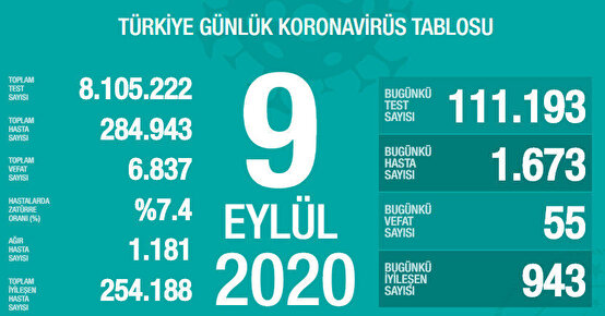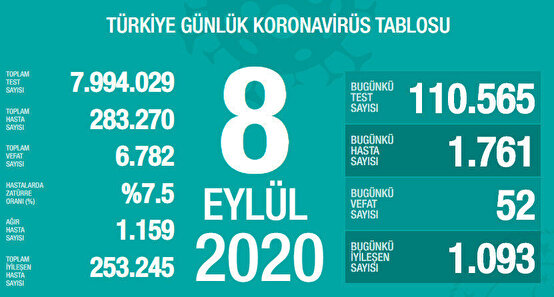 Toplam test sayısı 8 milyon 423 bin 463, vaka sayısı 289 bin 635, vefat sayısı 6 bin 999 olarak kayıtlara geçti.Aktif hasta 24 bin 905, ağır hasta sayısı 1241, hastalarda zatürre oranı ise yüzde 7,2 oldu.