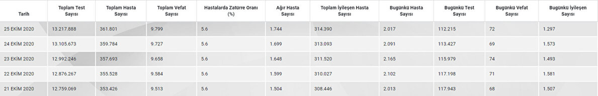 Sağlık Bakanlığının sitesindeki Koronavirüs Bilgilendirme Sayfası'nda 26 Ekim koronavirüs tablosu açıklandı. Ağır ve aktif hasta sayısının artmaya devam ettiğini belirten Sağlık Bakanı Koca, "Salgının bölgesel tırmanışını durdurmak için birlikte mücadele etmek zorundayız. Tedbirden daha güçlü bir silahımız bugün için yok. Salgına karşı organize olalım." ifadelerini kullandı. İşte o kritik veriler...