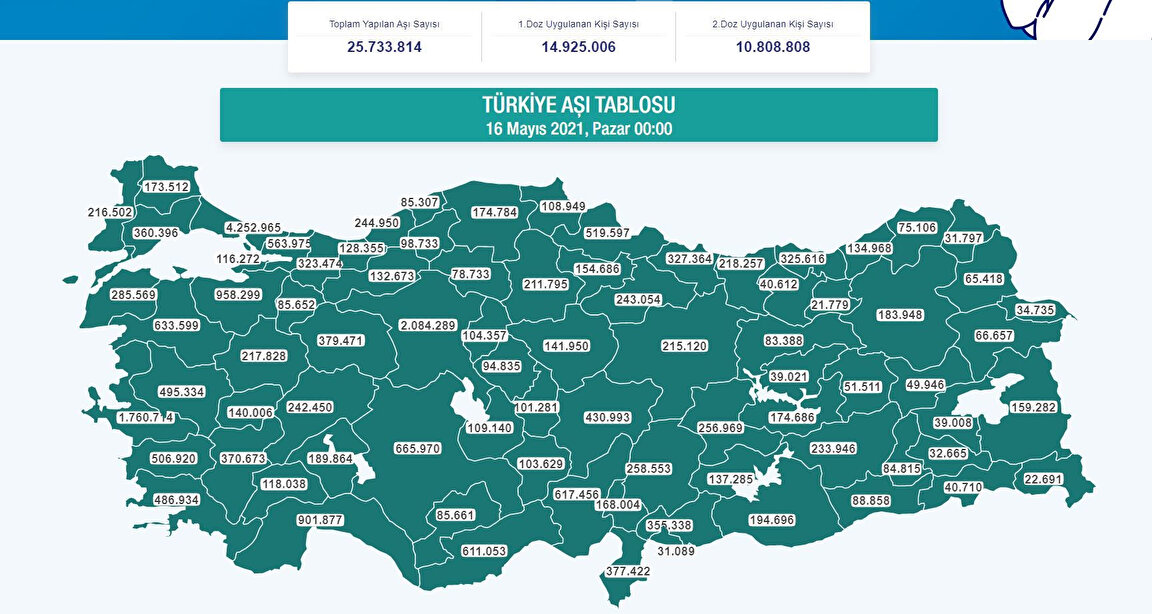Sağlık Bakanlığı'nın 16 Mayıs itibarıyla güncellediği Türkiye Aşı Tablosu'nda birinci ve ikinci doz toplam aşı miktarı 25 milyon 733 bin 814 oldu.