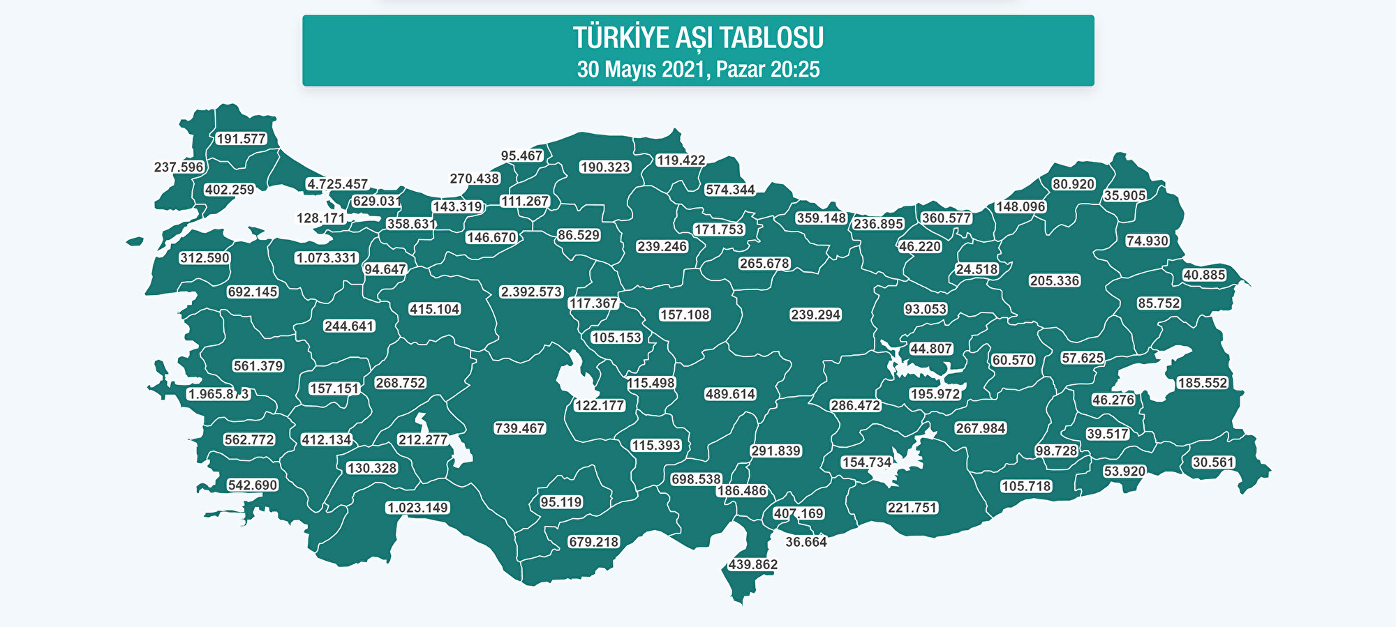 Sağlık Bakanlığının "covid19asi.saglik.gov.tr" adresinde yer alan anlık verilere göre, 30 Mayıs saat 19.45 itibarıyla uygulanan birinci doz aşı sayısı 16 milyon 512 bin 462, ikinci doz aşı 12 milyon 313 bin 216 oldu.