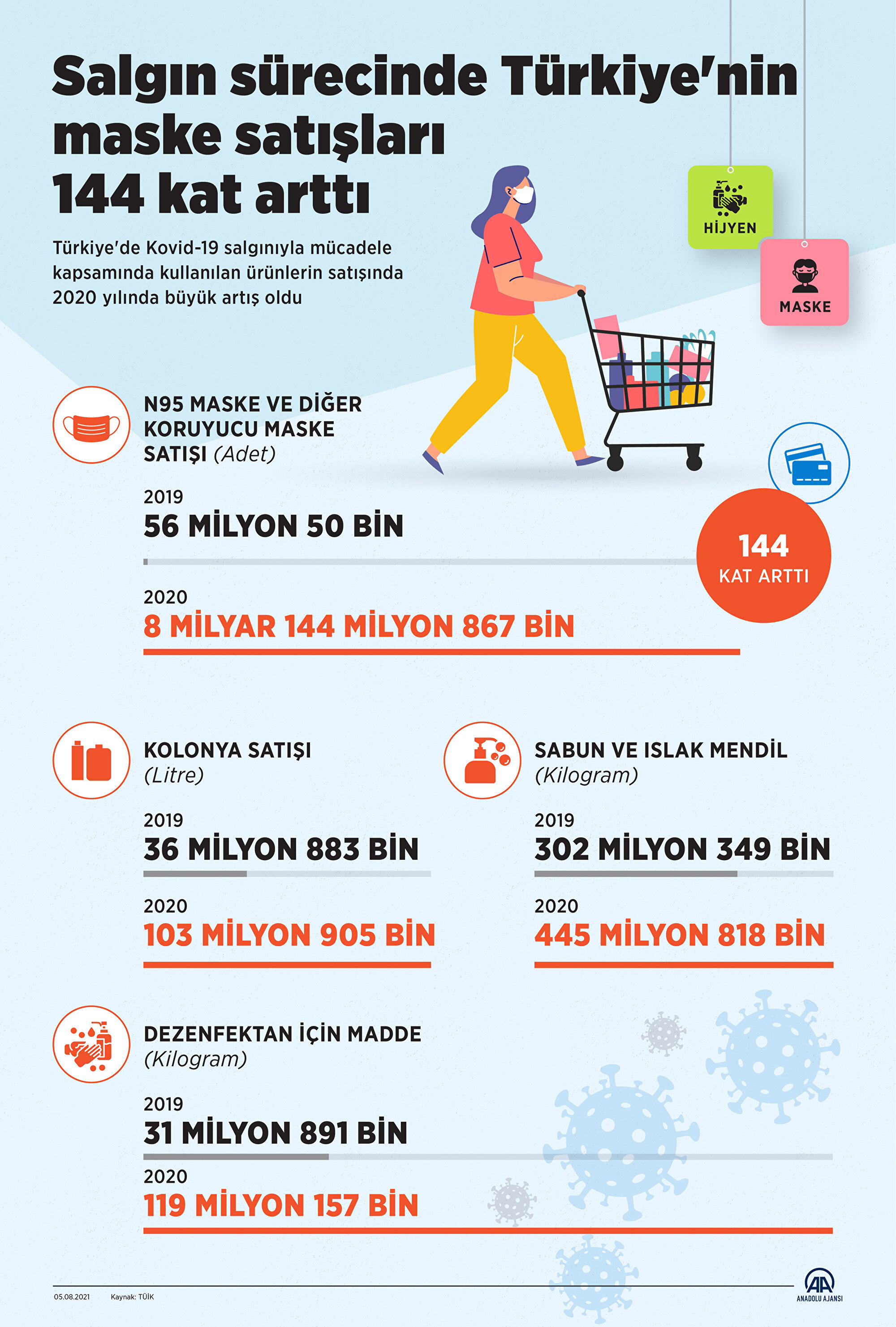 Türkiye'de geçen yıl yeni tip koronavirüs (Kovid-19) salgınıyla mücadele kapsamında kullanılan maske, kolonya ve dezenfektan gibi ürünlerin üretimden satışında büyük artış oldu. 2019'da 56 milyon 50 bin 527 olan maske satışı, geçen yıl 8 milyar 144 milyon 867 bin 472'ye çıktı