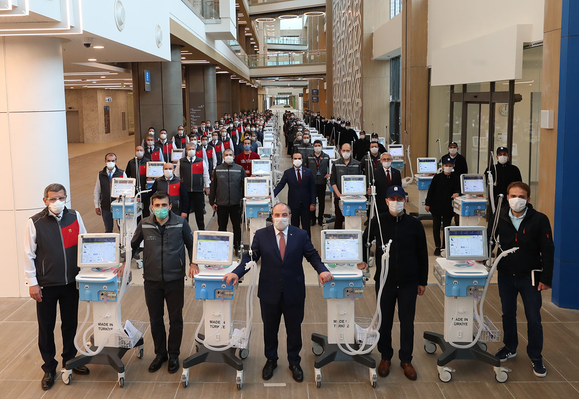Nitekim bakanlığımızın destekleriyle kurulan Biosys isimli bir girişim firmasının bu alanda yaptığı çalışmalar, geliştirdiği bir ürün zaten vardı. Bu çalışmaları hızla seri üretime dönüştürmek için yerli firmalarımız bir milli seferberlik başlattı. Onlarca mühendis bir araya geldi, gece gündüz çalıştılar ve büyük bir özveriyle sadece 14 gün gibi kısa bir sürede seri üretim bandından ilk yerli ve milli yoğun bakım solunum cihazlarını indirdiler. Bugün testleri tamamlanmış ürünlerin bir kısmını Sağlık Bakanlığı'mıza teslim ediyoruz.İnşallah mayıs sonuna kadar 5 bin cihaz üretilmiş olacak.Tüm çabamız, sağlık çalışanlarımızın insanüstü emeklerine bir nebze de olsa katkı sağlamak."