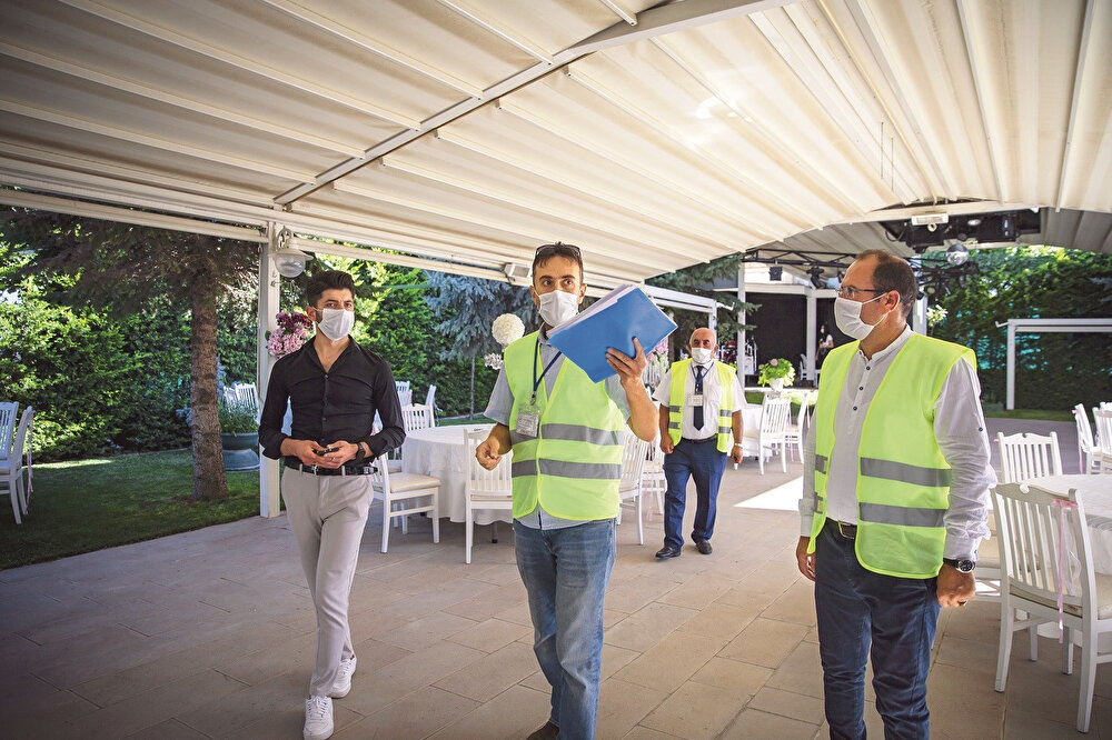 İçişleri Bakanlığı tarafından Türkiye genelinde bugün ve hafta sonu düğün, nişan, kına gecesi, sünnet düğünü gibi etkinliklerde denetim yapılmasına yönelik 81 il valiliğine gönderilen “Nişan/ Nikah, Düğün, Sahil Bölgeleri Denetimleri” konulu genelge kapsamında, Ankara’nın Gölbaşı ilçesindeki düğün salonları denetlendi. Düğün salonlarında maske, mesafe ve hijyen kuralları, masa düzeni ve mesafeleri, salon girişlerinde gelen misafirlerin ateş ölçümü ve masalarda el dezenfektanı bulundurma gibi alınan tedbirler kontrol edildi, oyun, halay ve dansın yasak olduğu belirtildi.