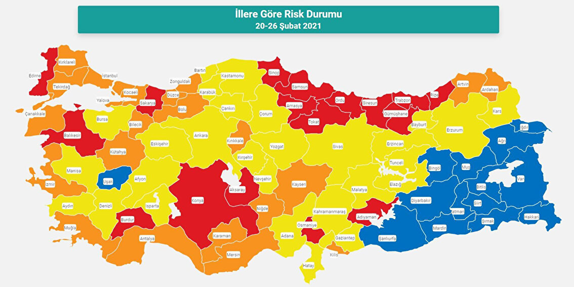 Bakanlıktan yapılan açıklamaya göre; Adıyaman, Aksaray, Amasya, Balıkesir, Burdur, Edirne, Giresun, Gümüşhane, Konya, Ordu, Osmaniye, Rize, Sakarya, Samsun, Sinop, Tokat ve Trabzon, çok yüksek riskli iller arasında yer alıyor.