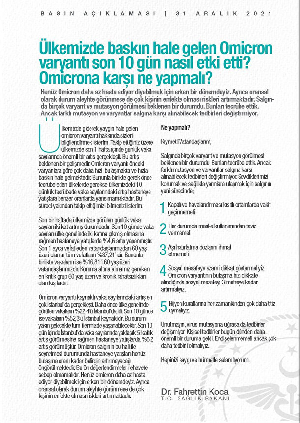 Sağlık Bakanı Fahrettin Koca, Türkiye'de de baskın hale gelen Omicron varyantına karşı ne yapılmasına ilişkin bir bilgi metni yayınladı.