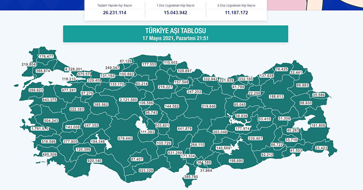 Sağlık Bakanlığının "covid19asi.saglik.gov.tr" adresinde yer alan anlık verilere göre, 17 Mayıs saat 21.00 itibarıyla uygulanan birinci doz aşı sayısı 15 milyon 43 bin 822, ikinci doz aşı 11 milyon 187 bin 32 oldu.