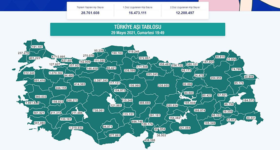 Sağlık Bakanlığı Türkiye'nin Aşı Tablosu sitesinde yayımlanan verilere göre, 1.Doz Uygulanan Kişi Sayısı 16 milyon 473 bin 111, 2.Doz Uygulanan Kişi Sayısı 12 milyon 288 bin 497 oldu.
