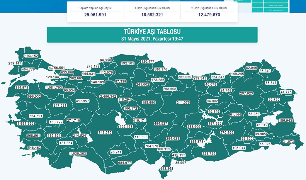 Sağlık Bakanlığı Türkiye'nin Aşı Tablosu sitesinde yayımlanan verilere göre, 1.Doz Uygulanan Kişi Sayısı 16 milyon 582 bin 321, 2.Doz Uygulanan Kişi Sayısı 12 milyon 479 bin 670 oldu.