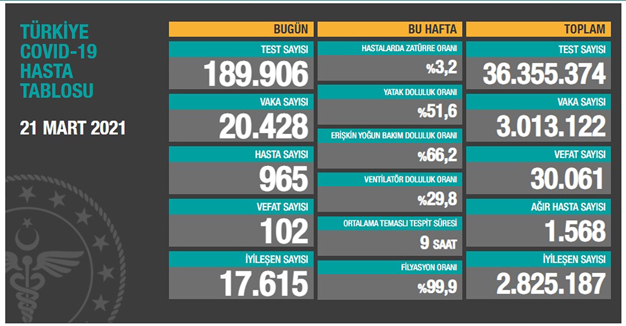 Türkiye Günlük Koronavirüs Tablosu, "covid19.saglik.gov.tr" adresinden paylaşıldı. Sağlık Bakanlığı'nca duyurulan 'Türkiye Covid- 19 Hasta Tablosu'na göre; son 24 saatte yapılan 189 bin 906 testte 20 bin 428 vaka, 965 hasta tespit edildi. Virüs nedeniyle 102 kişi hayatını kaybederken, 17 bin 615 kişi de iyileşti. Bugünkü verilerle toplam test sayısı 36 milyon 355 bin 374, toplam vaka sayısı 3 milyon 13 bin 122, toplam vefat sayısı 30 bin 61, toplam ağır hasta sayısı 1568, toplam iyileşen hasta sayısı ise 2 milyon 825 bin 187 oldu.