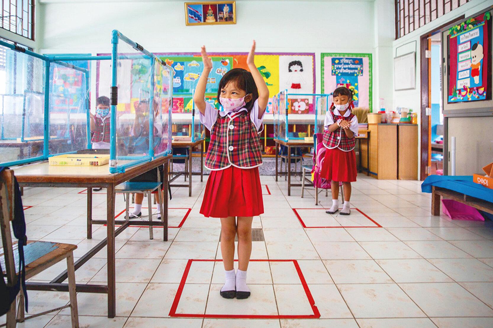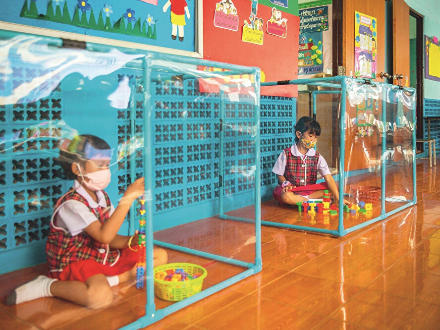 Kovid-19 salgını nedeniyle eğitim-öğretimin nasıl sürdürüleceği tartışmaları devam ederken Tayland’da okullar yeniden faaliyete başladı. Maske takmanın zorunlu olduğu okullarda, sıraların arasına da paravanlar gerildi.
