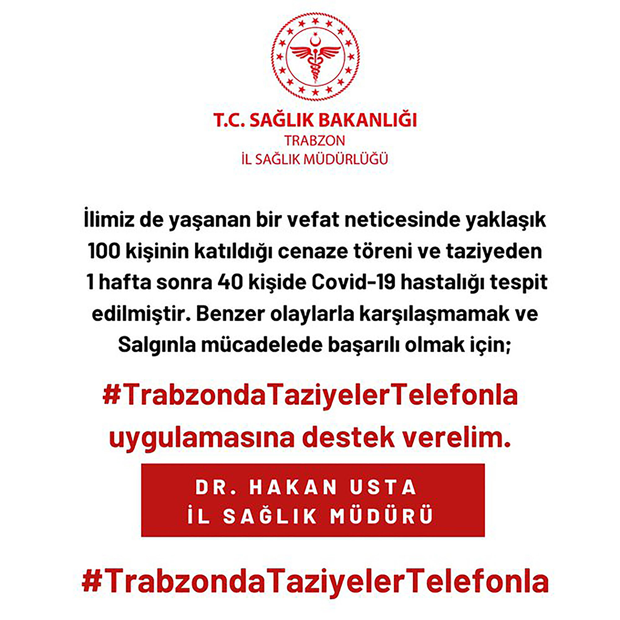 - Trabzon İl Sağlık Müdürü Dr. Hakan Usta sosyal medya hesabından, "İlimizde yaşanan bir vefat neticesinde yaklaşık 100 kişinin katıldığı cenaze töreni ve taziyeden 1 hafta sonra 40 kişide Covid-19 hastalığı tespit edilmiştir. Benzer olaylarla karşılaşmamak ve salgınla mücadelede başarılı olmak için Trabzon'da taziyeler telefonla" paylaşımında bulundu.