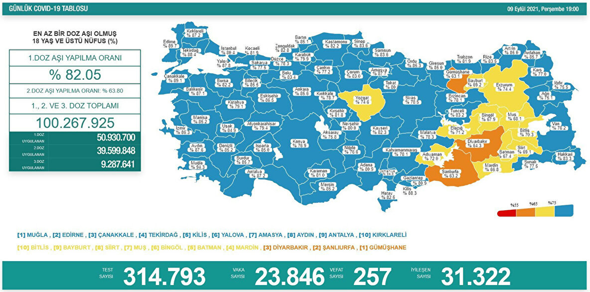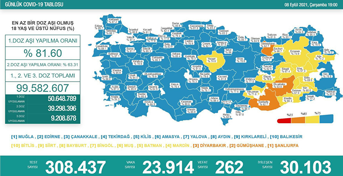 En az bir doz aşı yapılanların oranı en az iller ise Gümüşhane, Şanlıurfa, Diyarbakır, Mardin, Batman, Bingöl, Muş, Siirt, Bayburt ve Bitlis olarak sıralandı.