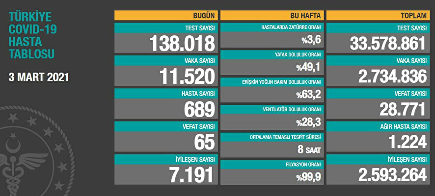 Haftalık verilere göre, bu hafta hastalarda zatürre oranı yüzde 3,8, yatak doluluk oranı yüzde 51,5, erişkin yoğun bakım doluluk oranı yüzde 62,4, ventilatör doluluk oranı yüzde 31, ortalama temaslı tespit süresi 8 saat, filyasyon oranı yüzde 99,9 olarak kayda geçti.