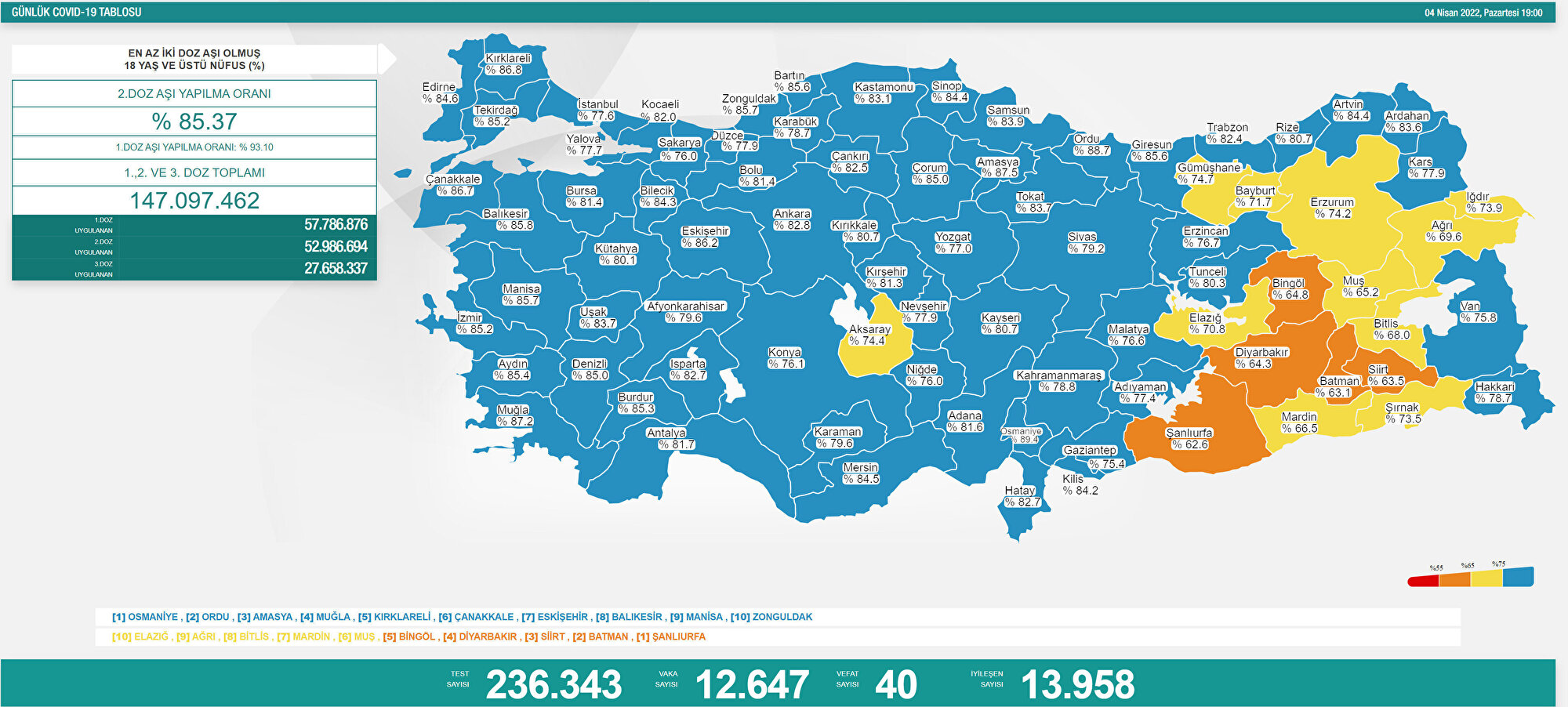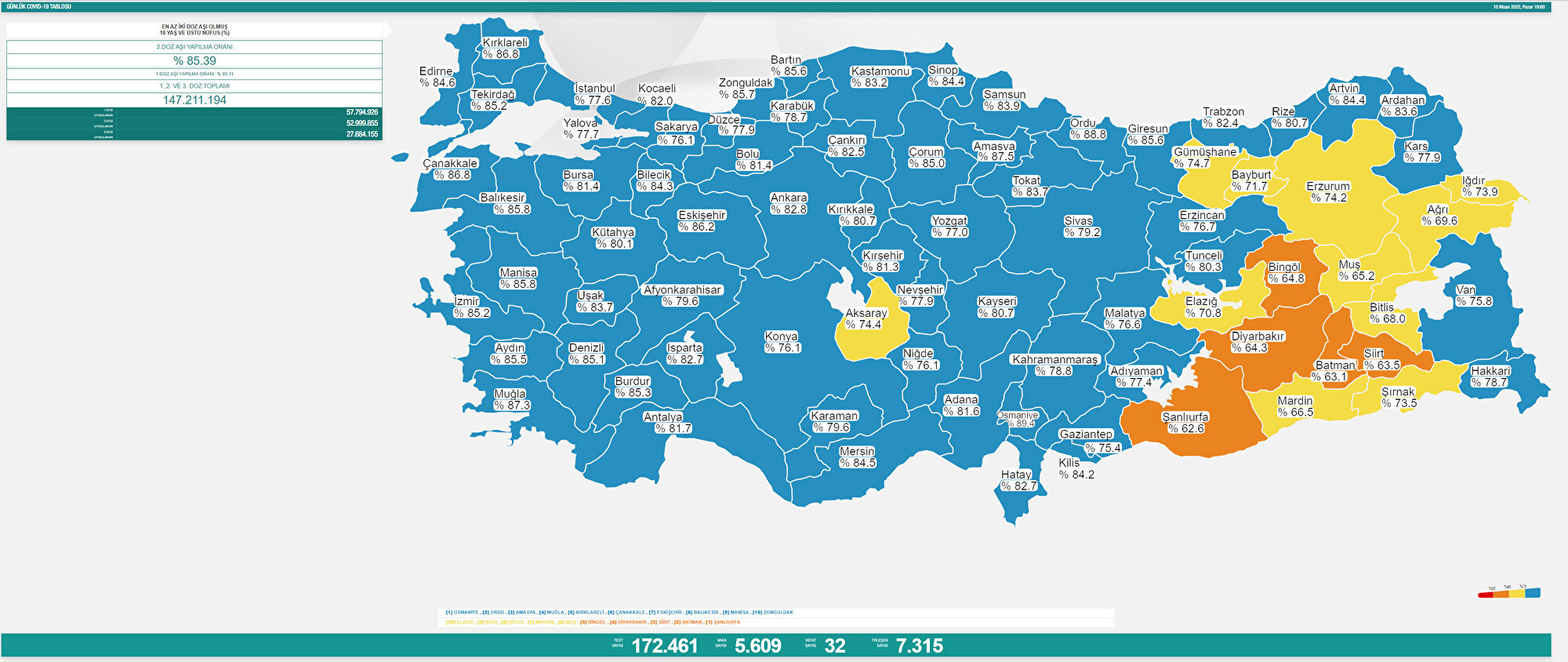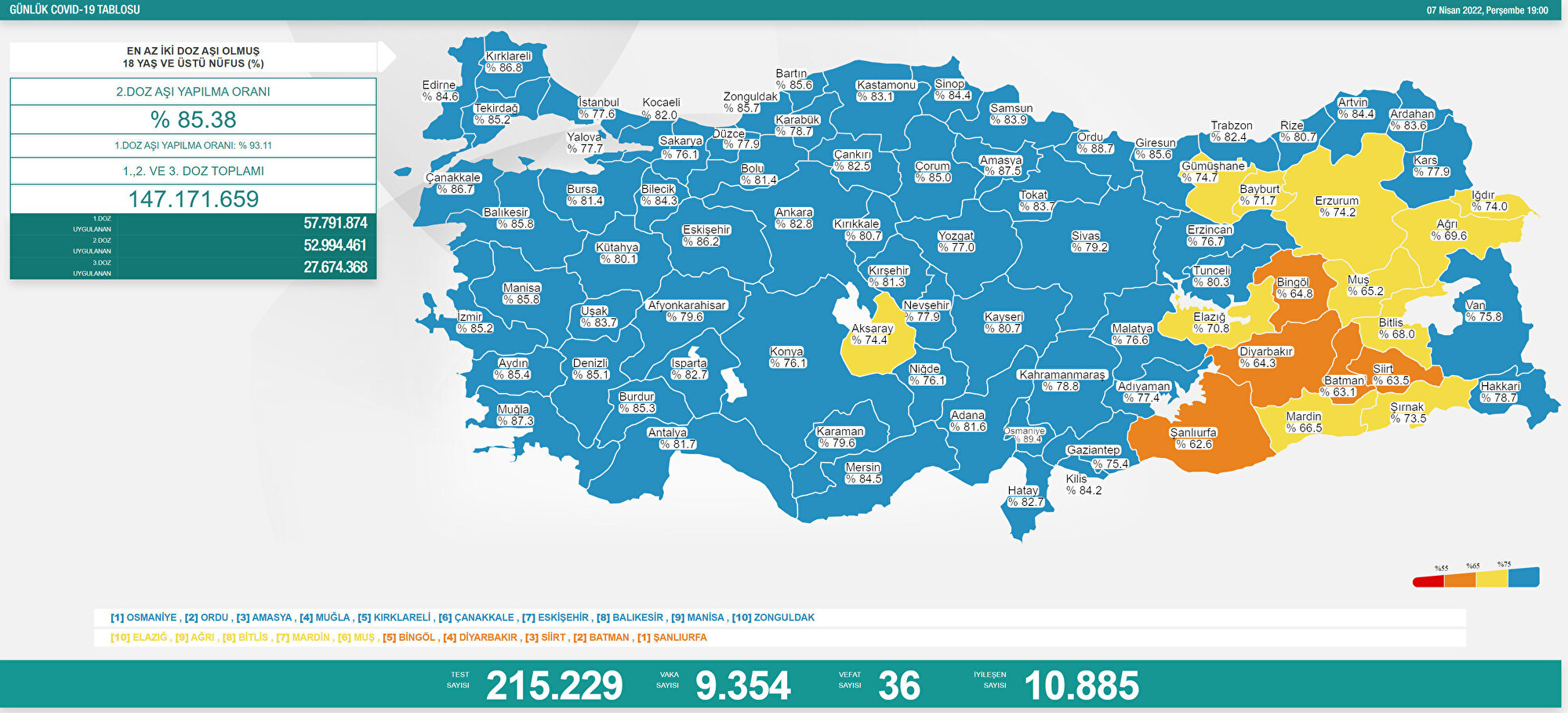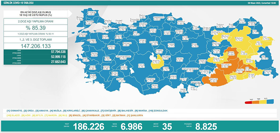 18 yaş üstünde en az iki doz aşı yaptıranların oranının en yüksek olduğu 10 il, Osmaniye, Ordu, Amasya, Muğla, Kırklareli, Çanakkale, Eskişehir, Balıkesir, Manisa ve Zonguldak oldu.
