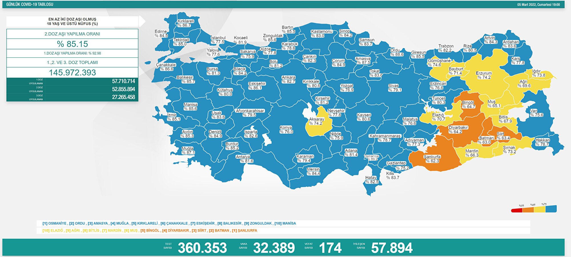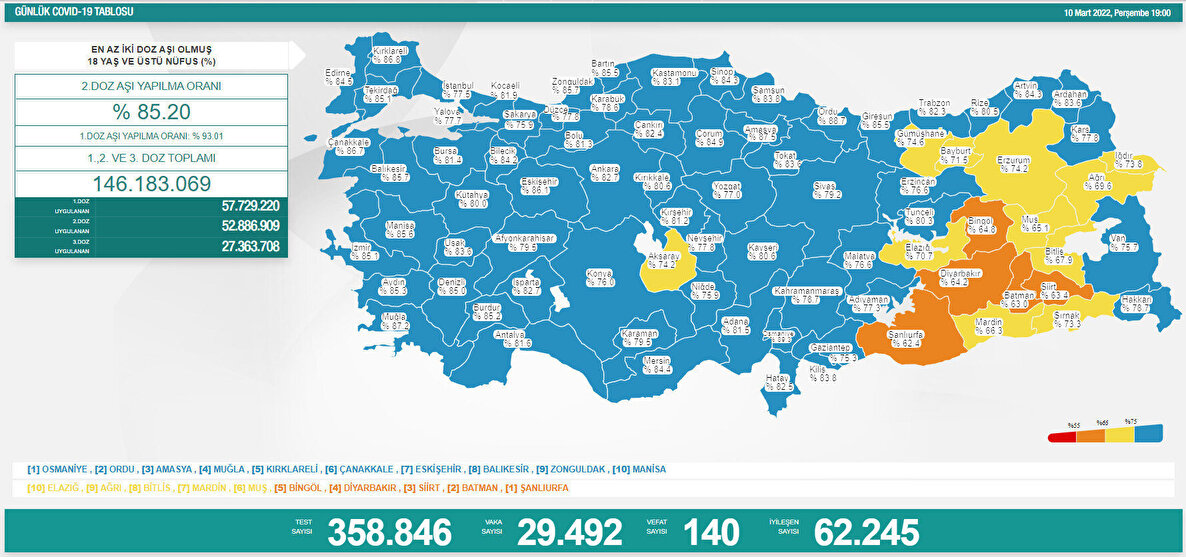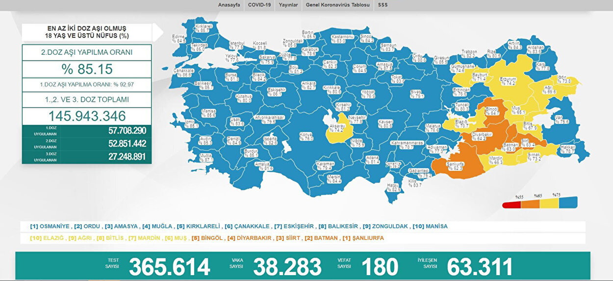 18 yaş ve üstü nüfusta en az iki doz aşı yaptıranların oranının en yüksek olduğu 10 il Osmaniye, Ordu, Amasya, Muğla, Kırklareli, Çanakkale, Eskişehir, Balıkesir, Zonguldak ve Manisa oldu.