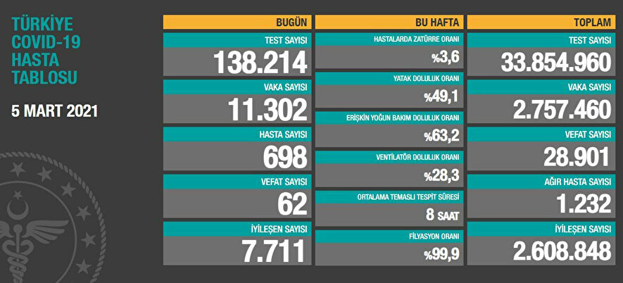 Haftalık verilere göre, bu hafta hastalarda zatürre oranı yüzde 3,8, yatak doluluk oranı yüzde 51,5, erişkin yoğun bakım doluluk oranı yüzde 62,4, ventilatör doluluk oranı yüzde 31, ortalama temaslı tespit süresi 8 saat, filyasyon oranı yüzde 99,9 olarak kayda geçti.