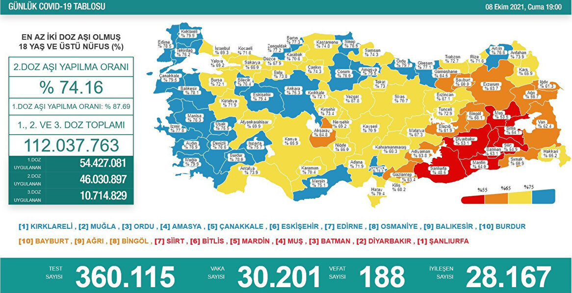 - Tabloyu Twitter hesabından paylaşan Sağlık Bakanı Fahrettin Koca, "YILGINLIK BİZE ZARAR VERİR. Aşısı bulunmuş bir bulaşıcı hastalıkla mücadele ettiğimizi unutmayın. Biraz zamana ve tam doz aşılanma oranının artmasına ihtiyacımız var. Bu gerçek yeterince büyük bir moral kaynağıdır. Salgınlara yol açan birçok hastalık yaygın aşıyla ortadan kalktı." dedi.