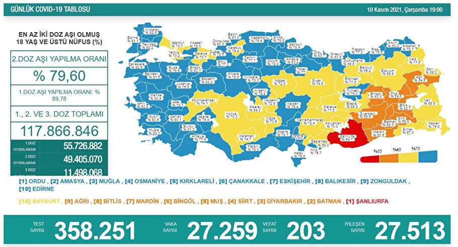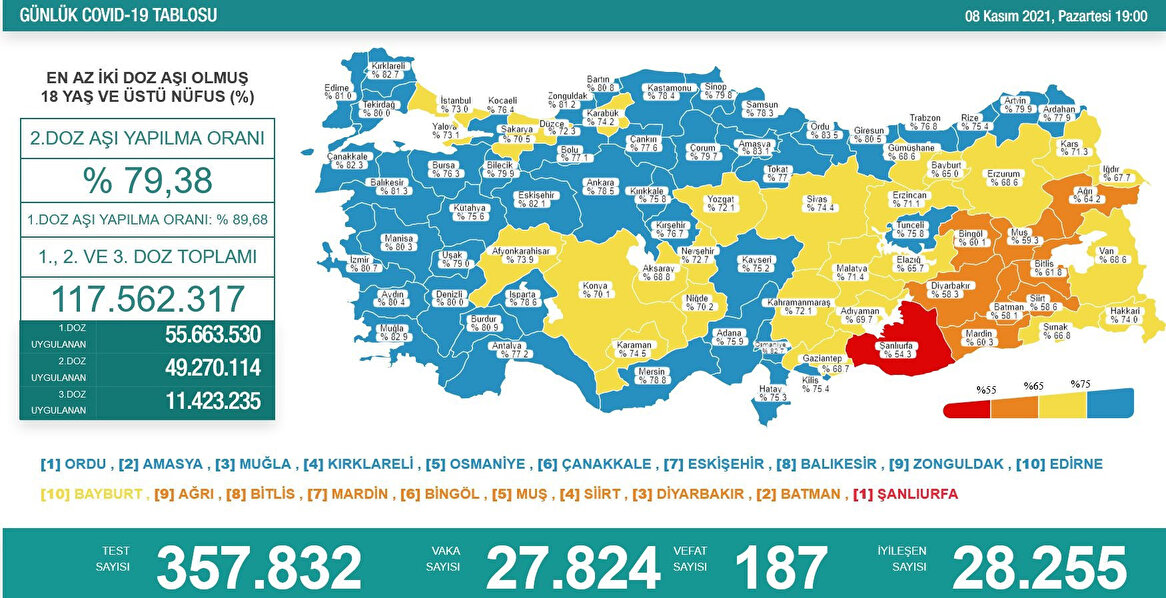 18 yaş üstünde en az iki doz aşı yaptıranların oranının en yüksek olduğu 10 il Ordu, Amasya, Muğla, Osmaniye, Kırklareli, Çanakkale, Eskişehir, Balıkesir, Zonguldak ve Burdur oldu.