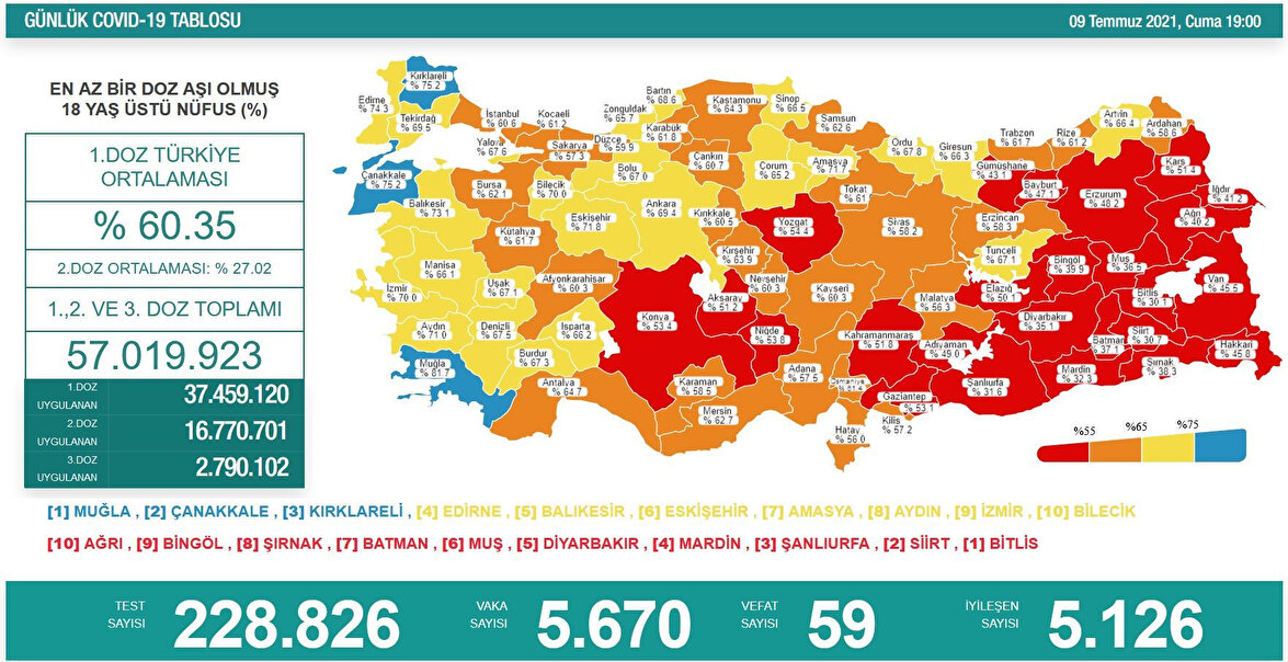 En az bir doz aşı uygulananların oranının en yüksek olduğu 10 il sırasıyla Muğla, Çanakkale, Kırklareli, Edirne, Balıkesir, Amasya, Eskişehir, Aydın, İzmir ve Bilecik oldu.