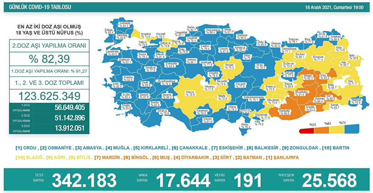 18 yaş üstünde en az iki doz aşı yaptıranların oranının en yüksek olduğu 10 il Ordu, Osmaniye, Amasya, Muğla, Kırklareli, Çanakkale, Eskişehir, Balıkesir, Zonguldak, Bartın oldu.