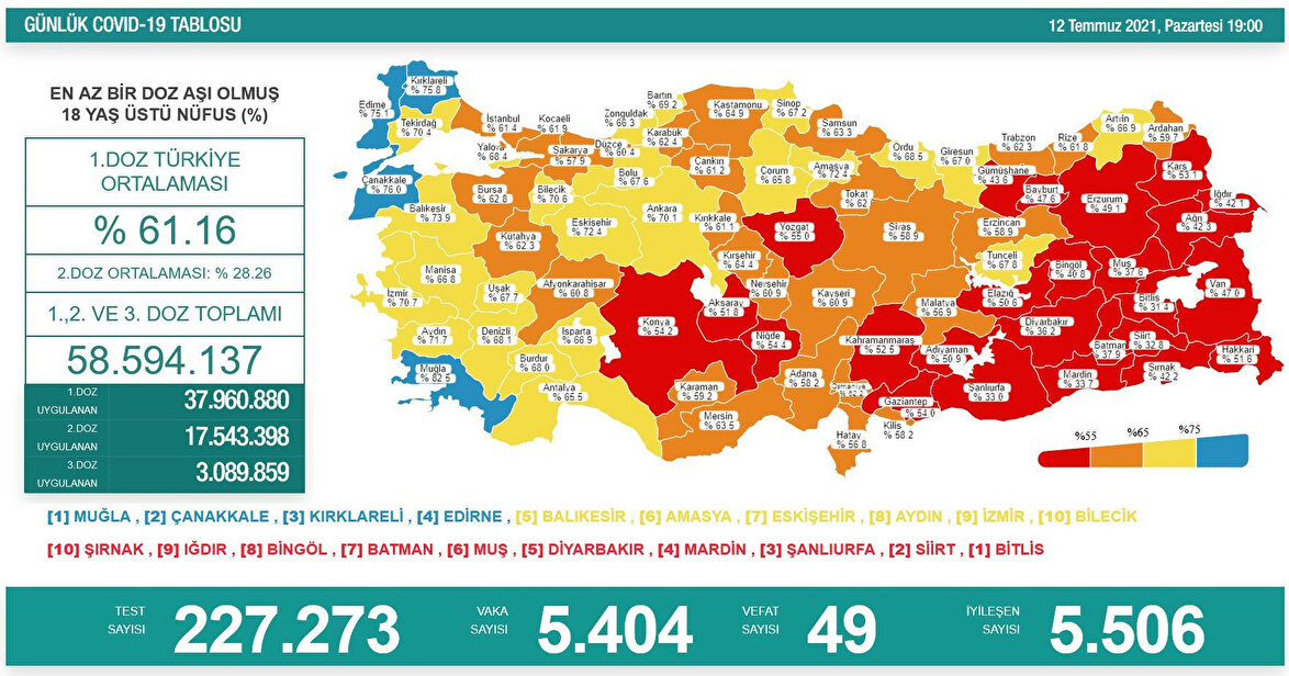 En yüksek aşılama oranına sahip iller; Muğla, Çanakkale, Kırklareli, Edirne, Balıkesir, Amasya, Eskişehir, Aydın, İzmir ve Bilecik olurken, en düşük aşılama oranına sahip iller ise Gümüşhane, Iğdır, Bingöl, Batman, Muş, Diyarbakır, Siirt, Mardin, Şanlıurfa ve Bitlis oldu.