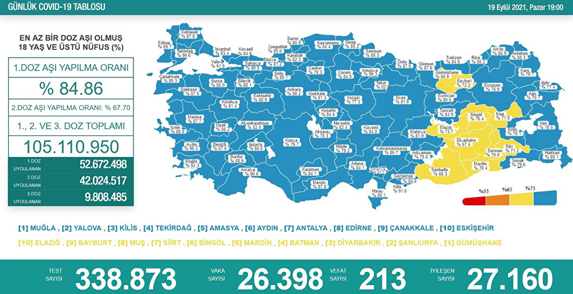 En az bir doz aşı yapılanların oranının en düşük olduğu iller ise Gümüşhane, Şanlıurfa, Diyarbakır, Batman, Mardin, Bingöl, Siirt, Muş, Bayburt ve Elazığ olarak sıralandı.