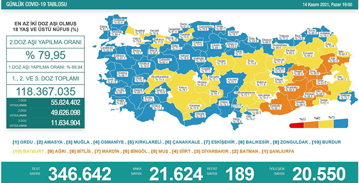 18 yaş üstünde en az iki doz aşı yaptıranların oranının en yüksek olduğu 10 il, Ordu, Osmaniye, Amasya, Muğla, Kırklareli, Çanakkale, Eskişehir, Balıkesir, Zonguldak ve Burdur oldu.