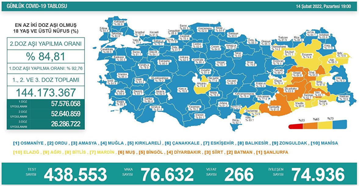 18 yaş üstünde en az iki doz aşı yaptıranların oranının en yüksek olduğu 10 il, Osmaniye, Ordu, Amasya, Muğla, Kırklareli, Çanakkale, Eskişehir, Balıkesir, Zonguldak ve Manisa oldu.