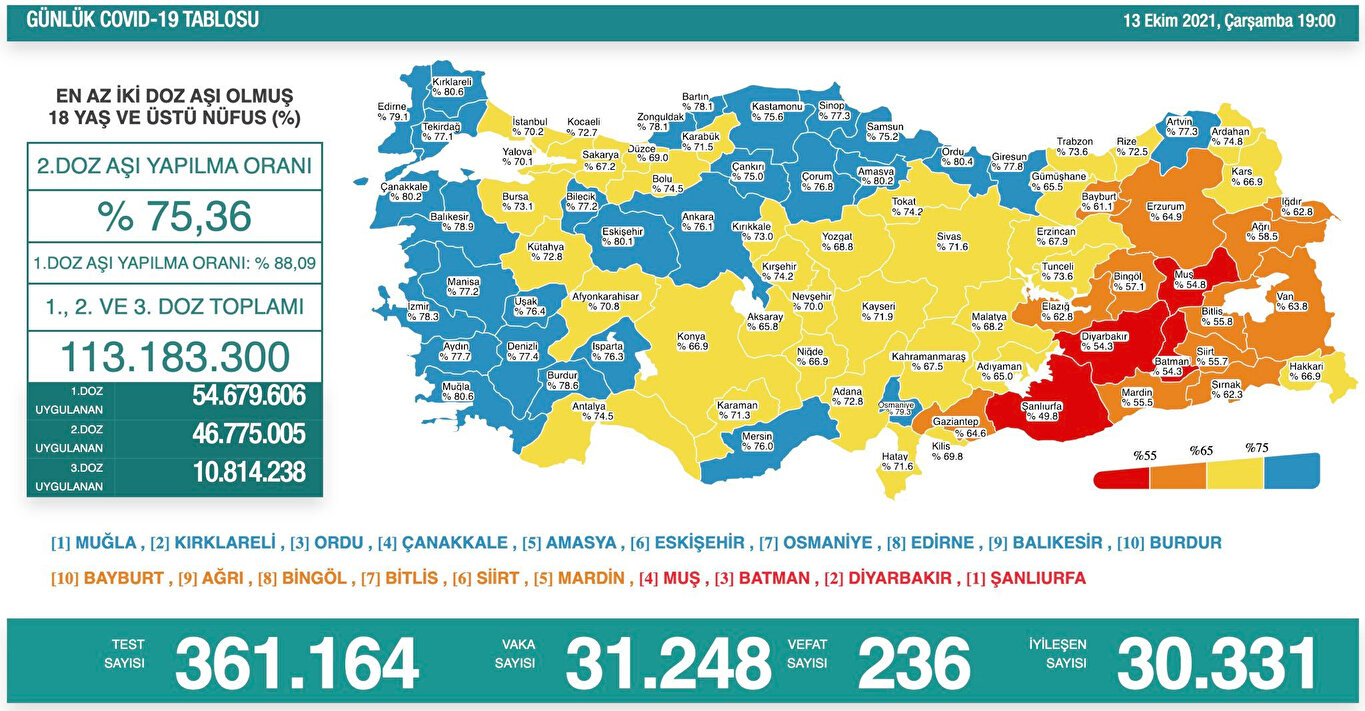 En az iki doz aşı yapılanların oranının en düşük olduğu iller ise Şanlıurfa, Batman, Diyarbakır, Muş, Siirt, Mardin, Bitlis, Bingöl, Ağrı ve Bayburt olarak sıralandı.