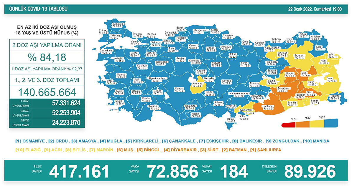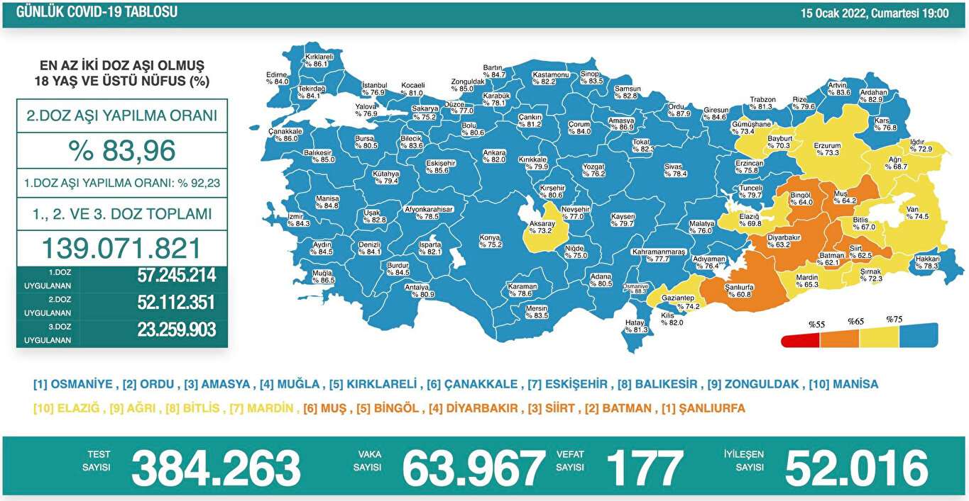 18 yaş ve üstü nüfusta en az iki doz aşı yaptıranların oranı en yüksek 10 il Osmaniye, Ordu, Amasya, Muğla, Kırklareli, Çanakkale, Eskişehir, Balıkesir, Zonguldak ve Manisa oldu.
