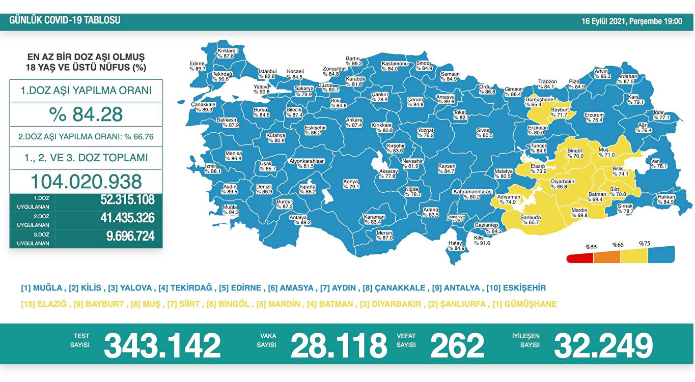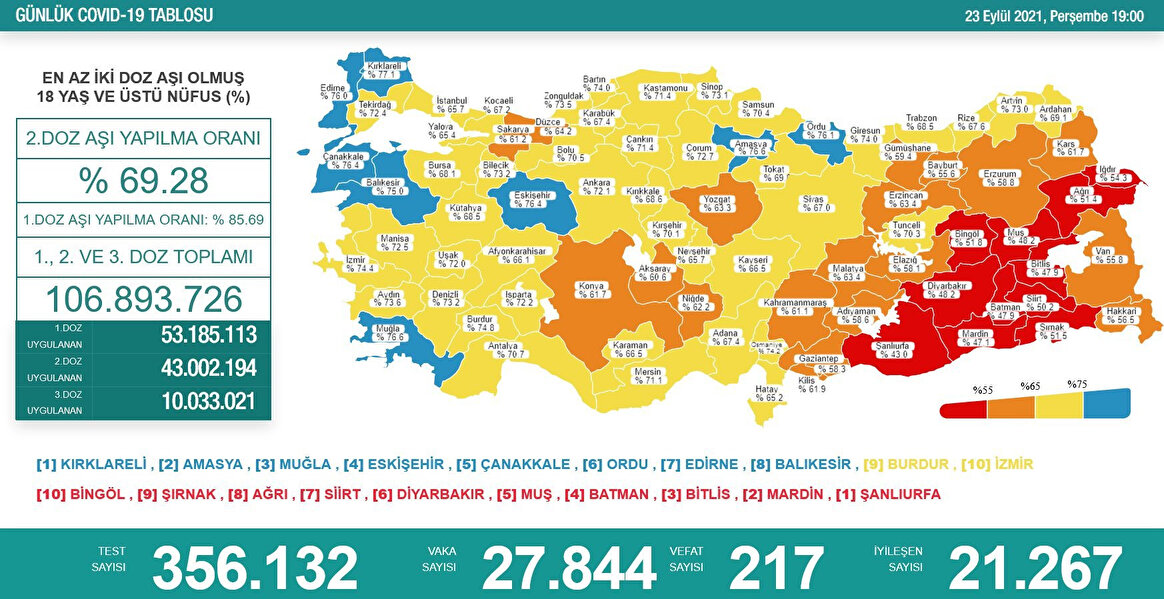 En az iki doz aşı yapılanların oranının en düşük olduğu iller ise Şanlıurfa, Mardin, Bitlis, Batman, Muş, Diyarbakır, Siirt, Ağrı, Şırnak ve Bingöl olarak sıralandı.