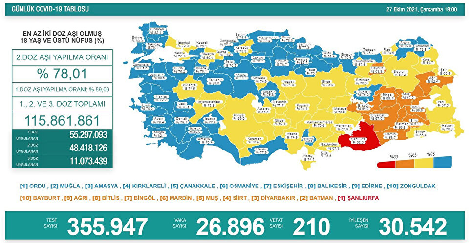 Bakanlığın tablosuna göre yüzde 52,6 ile Türkiye'de en az aşılamanın gerçekleştirildiği Şanlıurfa’yı sırasıyla Batman, Diyarbakır, Siirt, Muş, Mardin, Bingöl, Bitlis, Ağrı ve Bayburt takip etti.
