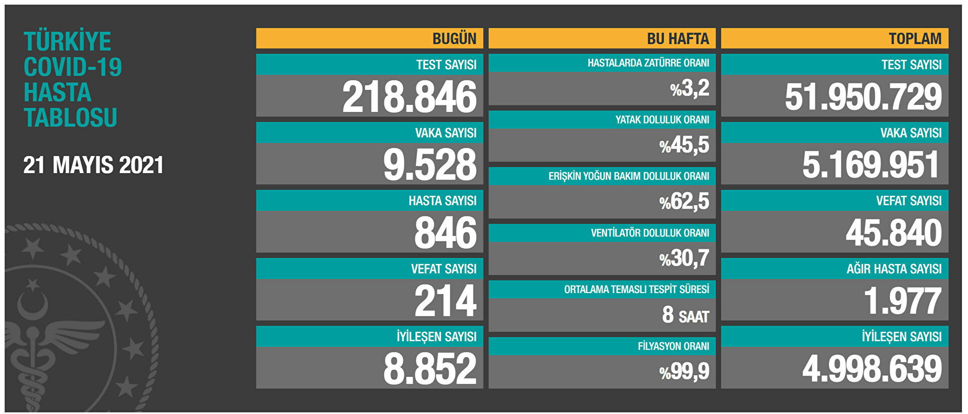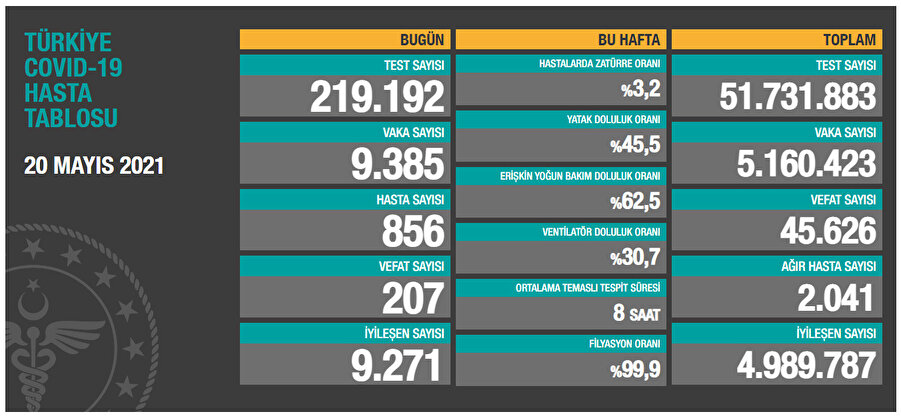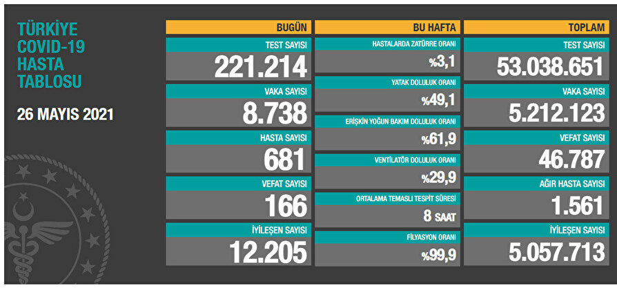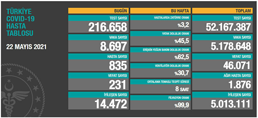 Haftalık verilere göre, bu hafta hastalarda zatürre oranı yüzde 3,1, yatak doluluk oranı yüzde 49,1, erişkin yoğun bakım doluluk oranı yüzde 61,9, ventilatör doluluk oranı yüzde 29,9, ortalama temaslı tespit süresi 8 saat ve filyasyon oranı yüzde 99,9 olarak kayda geçti.