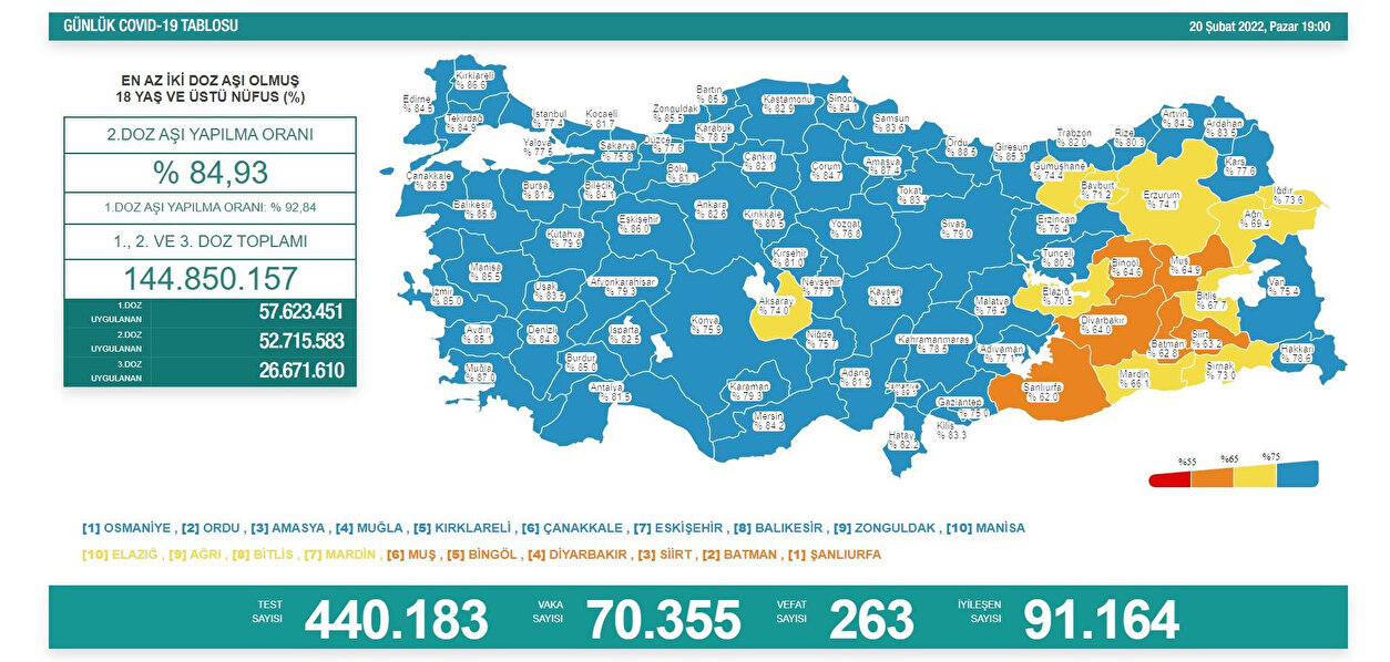 Bakanlığın tablosuna göre yüzde 62,2 ile Türkiye'de en az aşılamanın gerçekleştirildiği Şanlıurfa’yı sırasıyla Batman, Siirt, Diyarbakır, Bingöl, Muş, Mardin, Bitlis, Ağrı ve Elazığ takip etti.