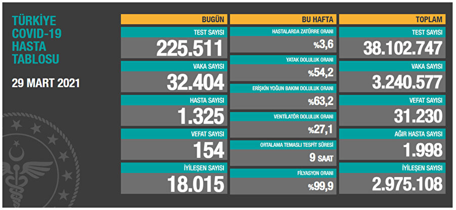Sağlık Bakanlığı'nın sitesindeki Koronavirüs Bilgilendirme Sayfası'nda 29 Mart koronavirüs tablosu yayınlandı. İşte 29 Mart koronavirüs vaka ve ölü sayıları...