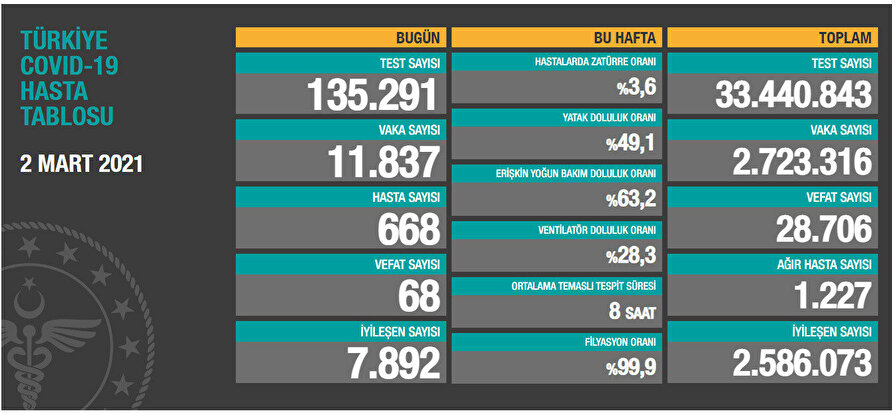 Sağlık Bakanlığı'nın sitesindeki Koronavirüs Bilgilendirme Sayfası'nda 3 Mart koronavirüs tablosu yayınlandı. Vaka sayılarında düne göre çok az bir azalma olmasına karşın hala kritik seviyelerde seyrediyor. İşte 3 Mart koronavirüs vaka ve ölü sayıları...